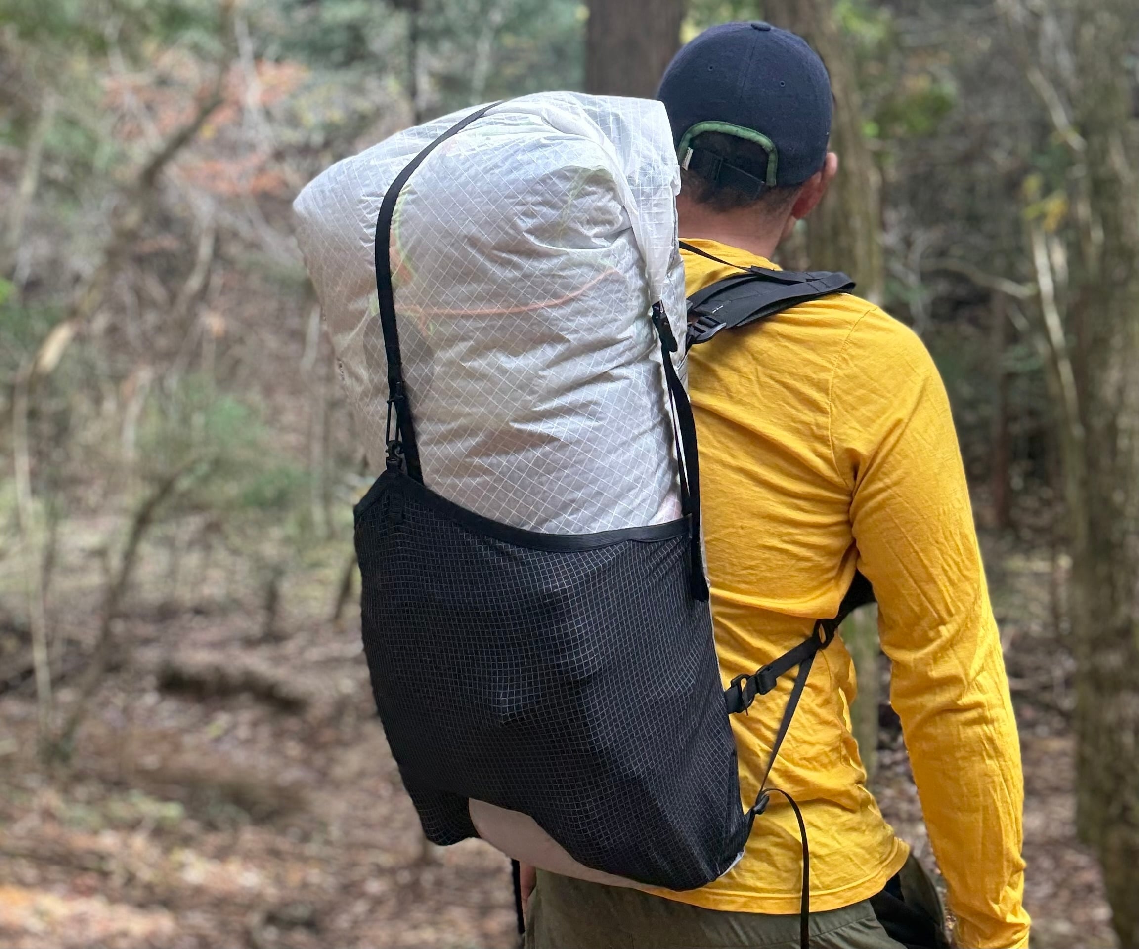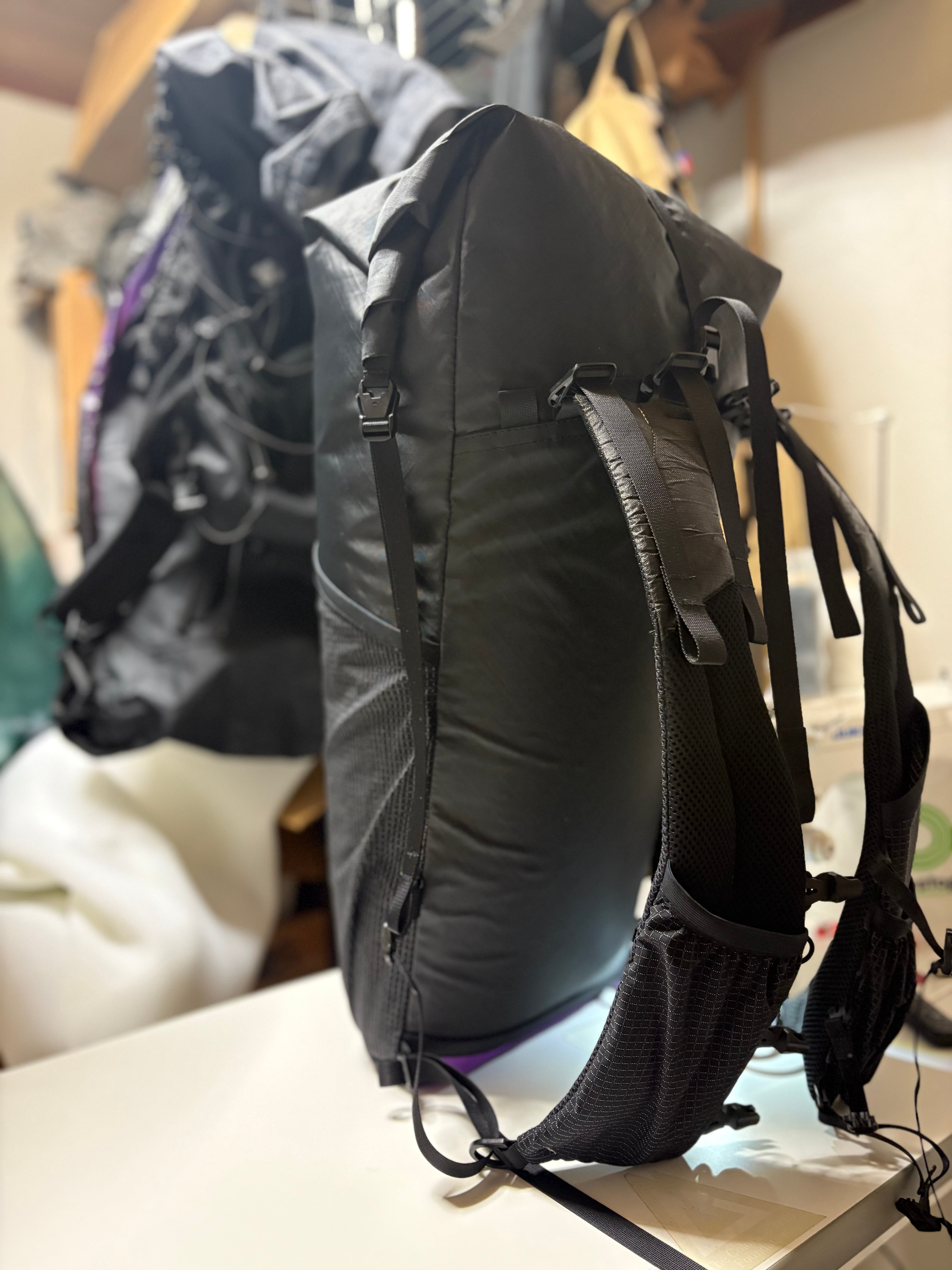 内部容量はメインで約20L(/最小)〜約27L(最大)、外部ラウンドポケットにはおおよそ4〜5L程度が入るかと思います。